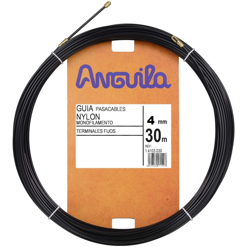 Guía pasa-cables de Nylon monofilamento de Ø 4 mm y 30 metros de longitud, color negro, provisto con terminales fijos, cabeza guía flexible de 6 mm Ø y anilla de tracción fija de 6 mm Ø. El Nylon es el material de mayor efecto memoria por lo que presenta más puntos de rozamiento, adquiriendo de forma original movimiento en espiral por lo que ejerce una menor fuerza de empuje, no siendo aconsejable su utilización en distancias superiores a los 20 o 25 metros.