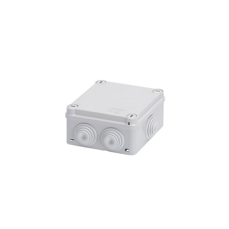 Caja IP55 100x100x50 1/4 GAS pasacable de color blanco de la gama 44 CE. Caja de derivación con tapa baja y tornillos de 1/4 giro, grado de protección IP55, para paredes con pasacables de entrada rápida, de dimensiones internas 100x100x50 mm y entradas con 6 orificios de 29 mm de diámetro. Tornillos de la tapa de tipo null.
