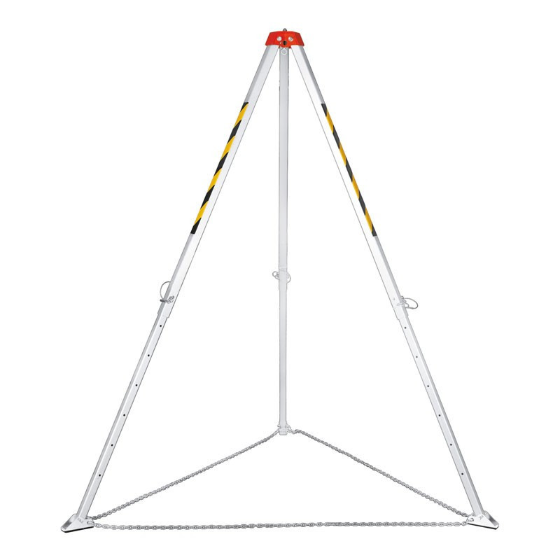 Trípode de rescate de aluminio con patas desplegables con goma antideslizante en su extremo inferior.