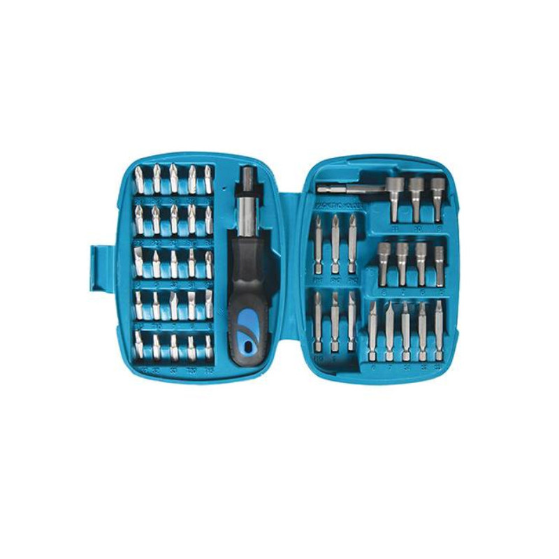 Mango de carraca engomado con funcionamiento en ambas direcciones y posición de bloqueo. Portapuntas magnético de 60 mm. Vástago hexagonal de 1/4" (6,35 mm). incluye: puntas de 25 mm: Phillips 1 x Nº 1, 5 x Nº 2 y 1 x Nº 3. Pozidriv Nº 1, 2 x Nº 2 y 1 x Nº 3. Planas: 1 x 5 mm, 3 x 6 mm y 1 x 7 mm. Trx 1 x T10, 2 x T15 y 1 x T20. Seguridad: 1 x 1, 2 x 3 y 1 x 3. Puntas 50 mm: Phillips 1 x Nº 1, 2 x Nº 2 y 1 x Nº 3. Planas 1 x 5 mm, 2 x 6 mm y 1 x 7 mm. Seguridad 1 x 1, 1 x 2 y 1 x 3. Vasos de 5 a 11 mm.