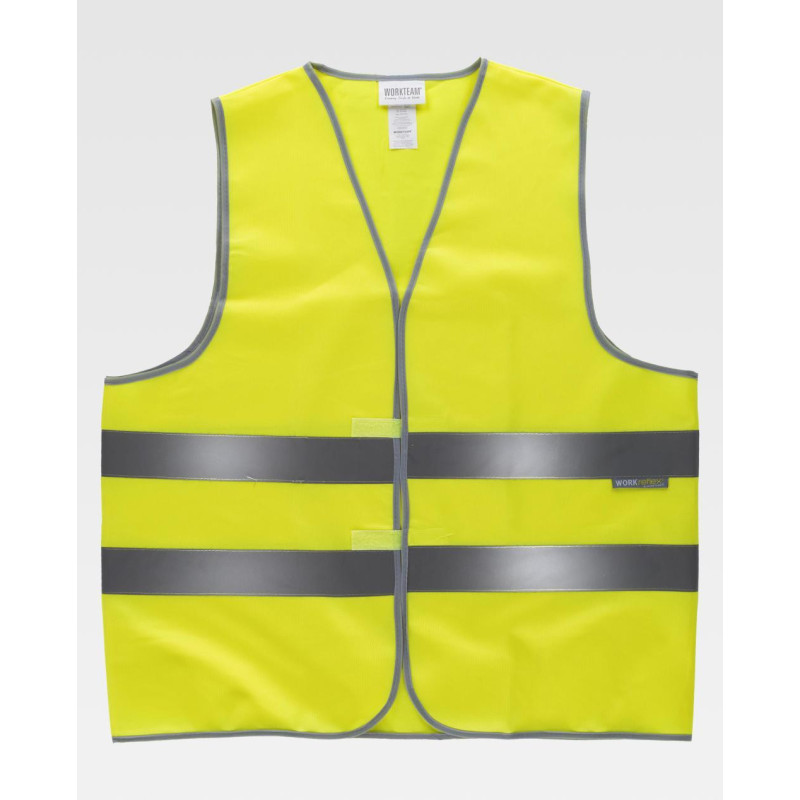 Chaleco de alta visibilidad con cintas reflectantes. Escote a pico y cierre de velcro adaptable. Dos cintas reflectantes en pecho y espalda. Ribeteado con bies a contraste.