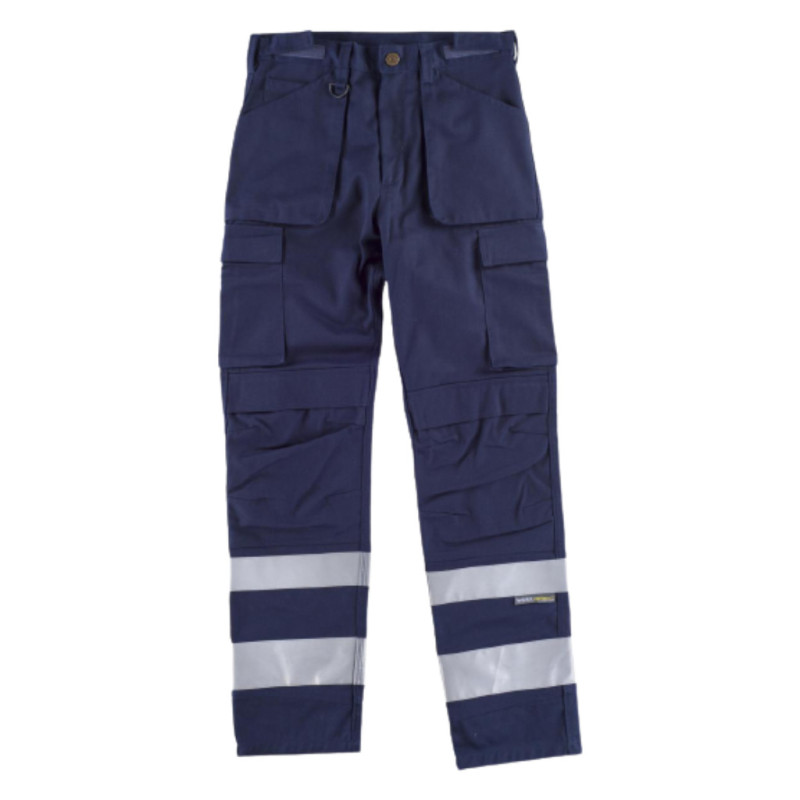 Pantalón recto multibolsillos, trabillas y ajuste de velcro en la cintura, dos bolsos de cargo en costados, bolsillos laterales y traseros de plastón con cartera y velcro, bolsillos para rodilleras, cintas reflectantes de diferentes tamaños. 65% Poliéster 35% Algodón