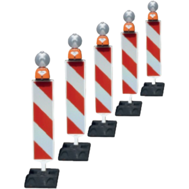 compuesta por 5 bases de caucho, 5 balizas luminosas y 5 palas banderola. Alimentacion con 10 baterias 4R25 de 6V 50Ah no incluidas