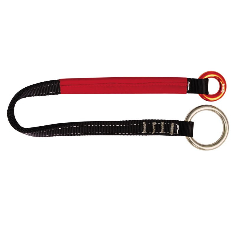 Eslinga de anclaje de 1,2 m, fabricada en poliéster, con dos anillas de aluminio en los extremos. Gracias a las anillas de diferentes diámetros (28 mm y 46 mm de diámetro respectivamente), se puede tirar de ella hacia abajo desde el suelo.